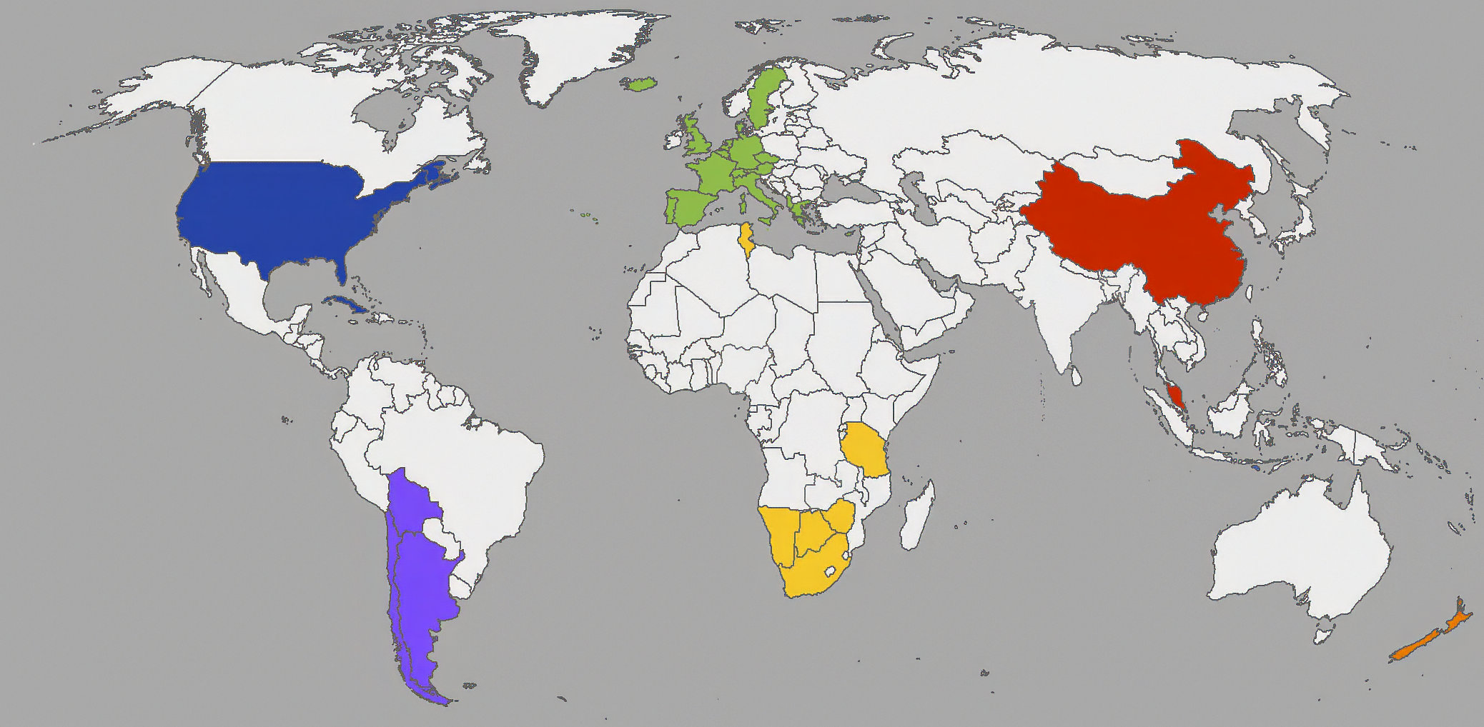 Botswana Namibië Tanzania Tunesië Zimbabwe Zuid Afrika China Maleisië Nieuw Zeeland |